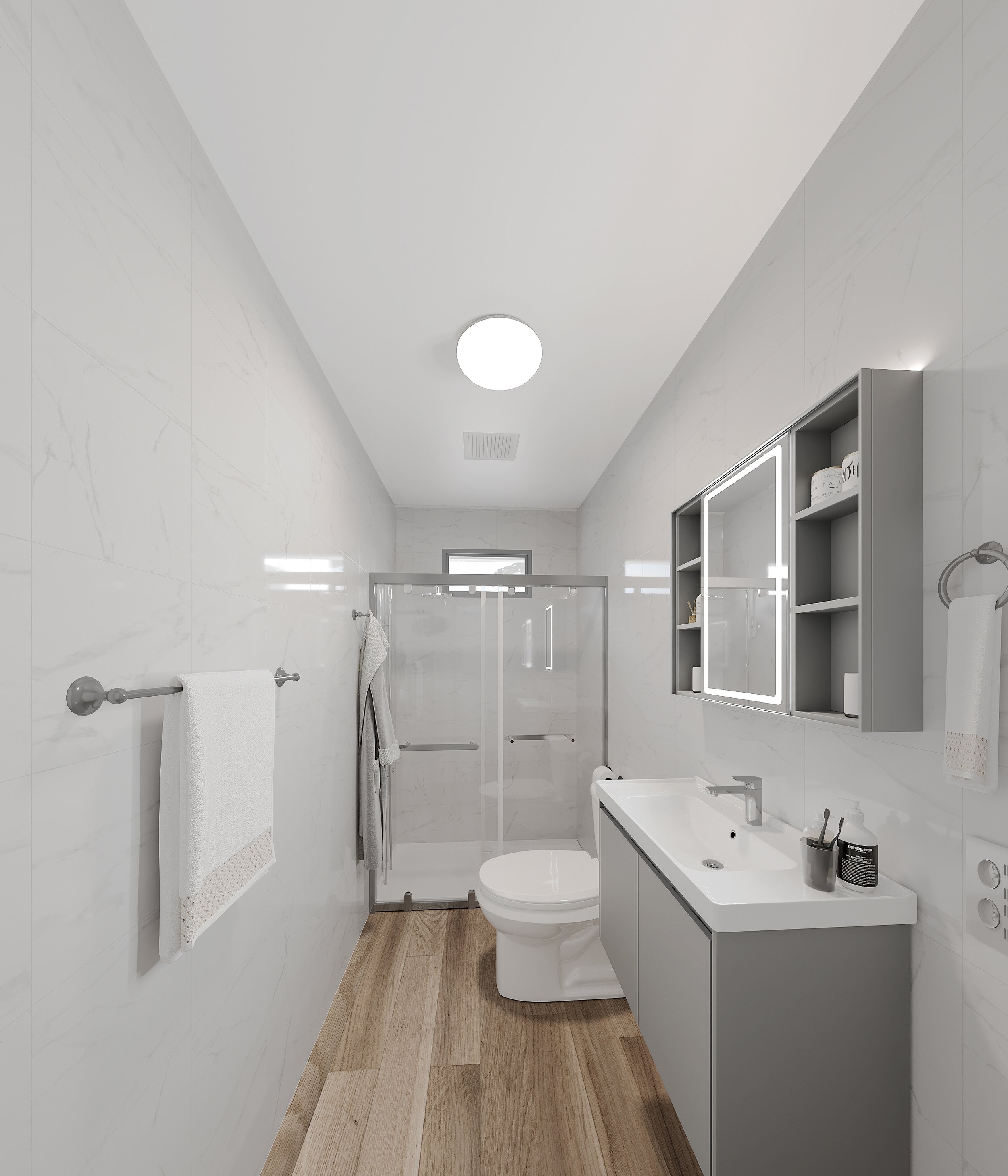 The layout includes a living room, a kitchen, three bedrooms, and two bathrooms. A dedicated laundry room is located near the back door. The exterior features a stone slate base and granite-texture finish coating on the walls. The roof is made of insulated sandwich panels with excellent thermal performance. This product comes with a comprehensive construction manual, making it possible for buyers—even without prior construction experience—to build this comfortable 69-square-meter home on their own by following the step-by-step guide.